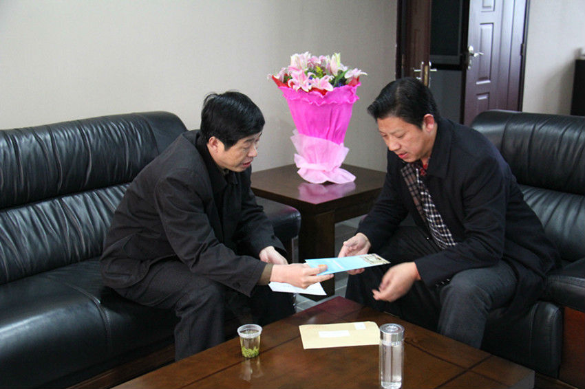 松滋法院院长徐忠德(左)向省人大代表、葛洲坝集团松滋水泥公司总经理邓继涛(右)介绍法院工作情况